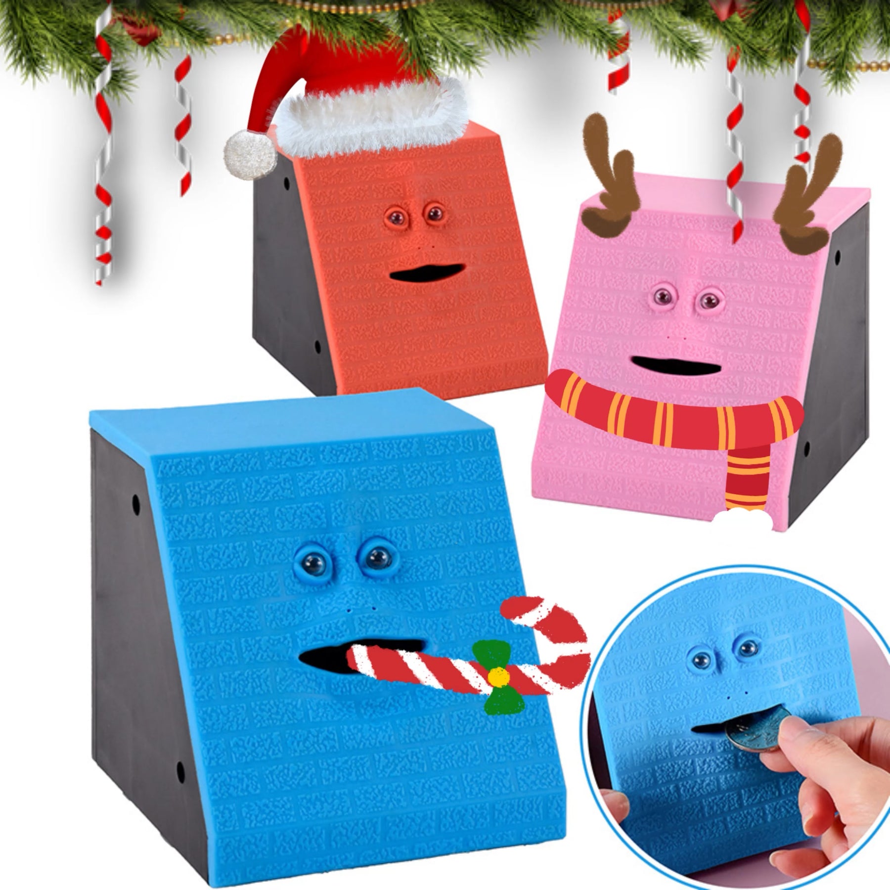 Piggy bank that will eat coinsAn extremely vivid face,put the coin into its open mouth.