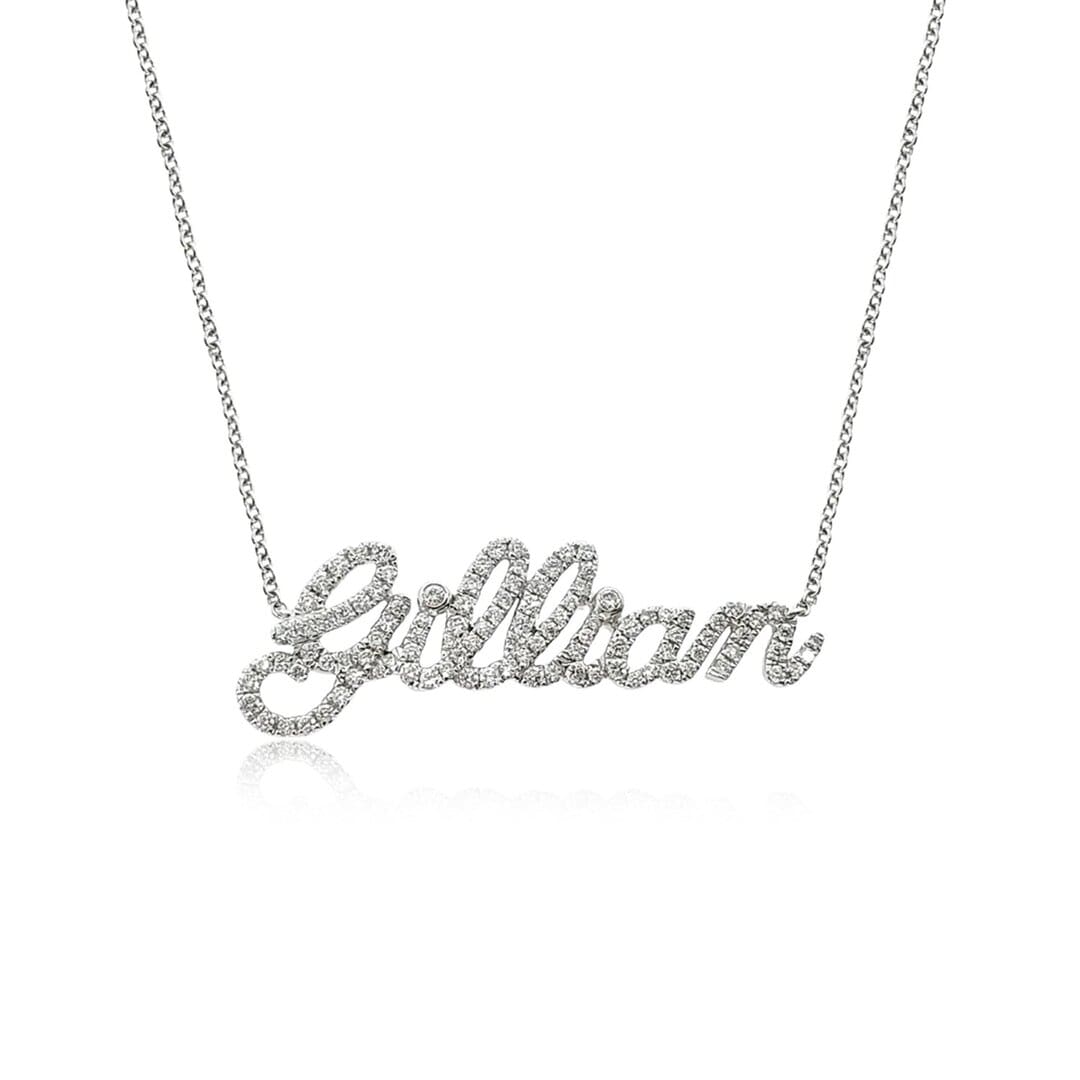 Name necklaces are a must for every fashionable woman. Our personalized diamond script nameplate necklace is made of solid 14k white gold and set with high-quality Moissanite diamonds to ensure your necklace will shine like stars.