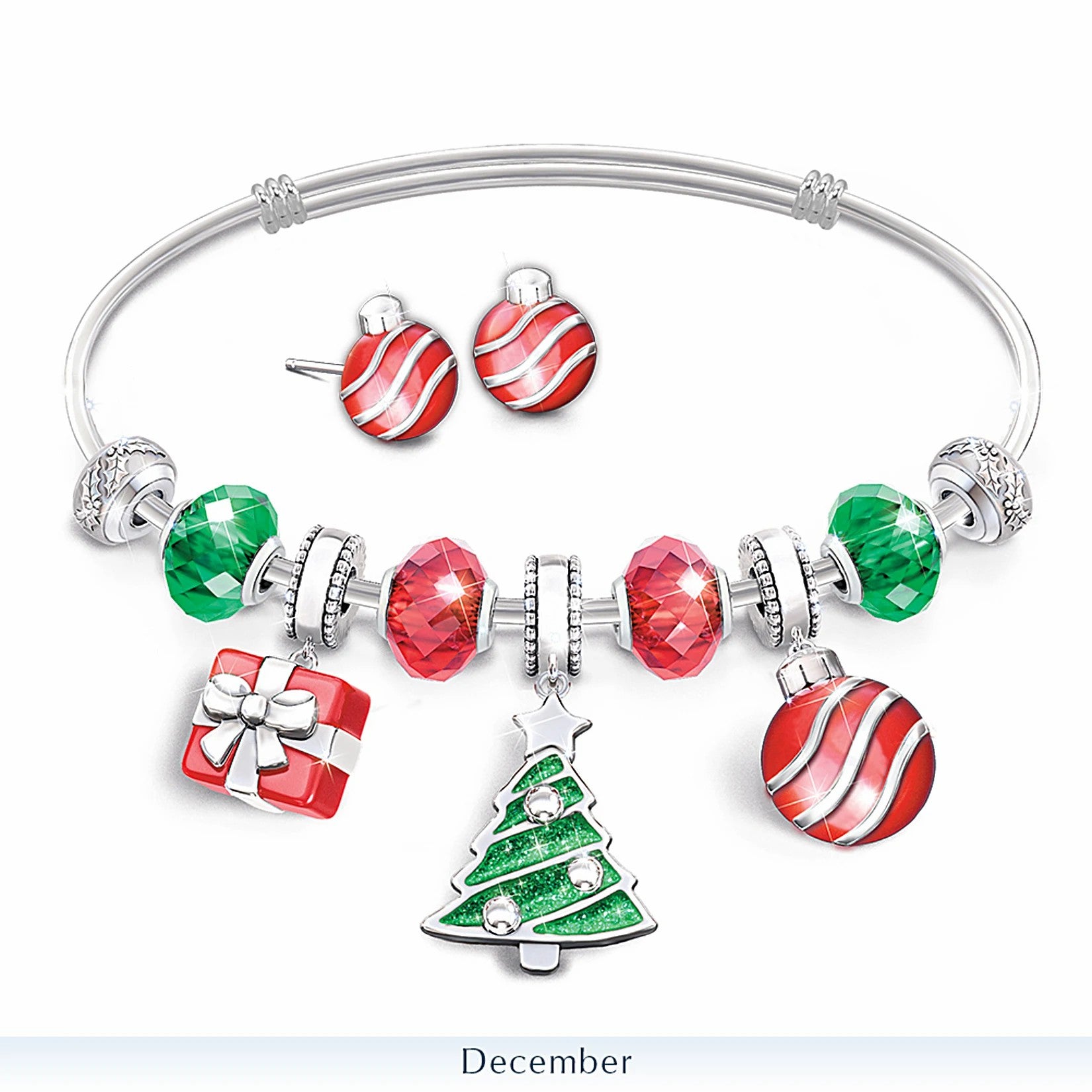 Arriving all put together and ready to wear, each adjustable charm bracelet in this collection boasts handcrafted sculpted charms with seasonal motifs, hand-enameled hanging charms and faceted crystal charms reflecting the season. Wear each bracelet and earring set all month long or switch them up to create an unforgettable statement for every occasion and outfit. The wooden collector's jewelry case features a glass lid and has compartments to hold all 12 handcrafted charm bracelets and earrings in this collection. Strong demand is anticipated for this festive holiday jewelry collection, so don't delay. Order now!